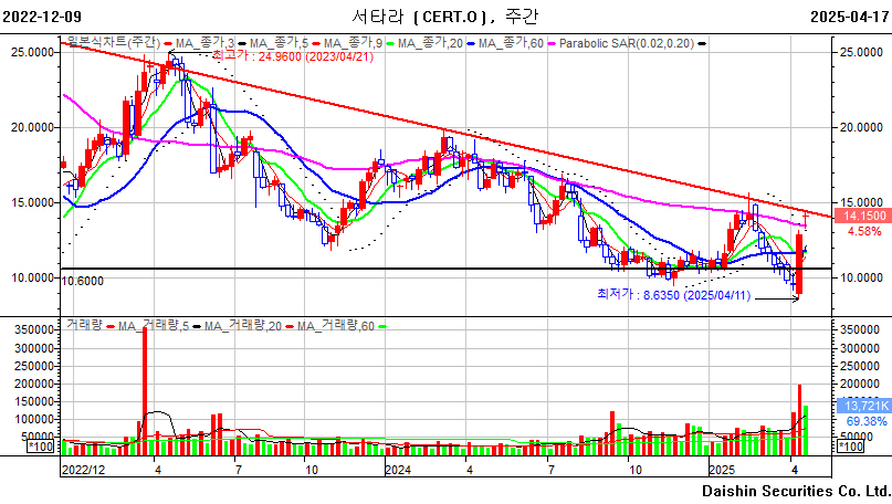 - 추세분석 : 중기 추세 전환을 위해서는 11.5불 유지가 중요하며, 아래에 하락추세선을 돌파 안착하는 것이 중요
