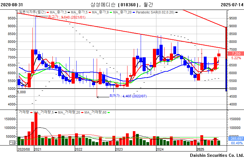 - 월봉상으로는 25년 7월부터 상승추세 시작으로 보이며, 9600원 을 돌파하면 장기 상승추세가 형성될 수 있습니다.
