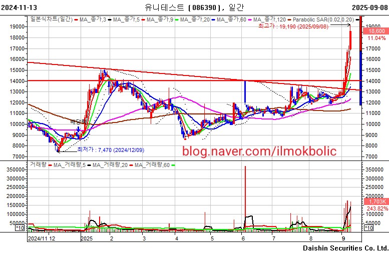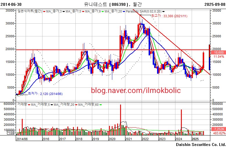 유니테스트 급등 이유는 월봉파동에 있습니다.