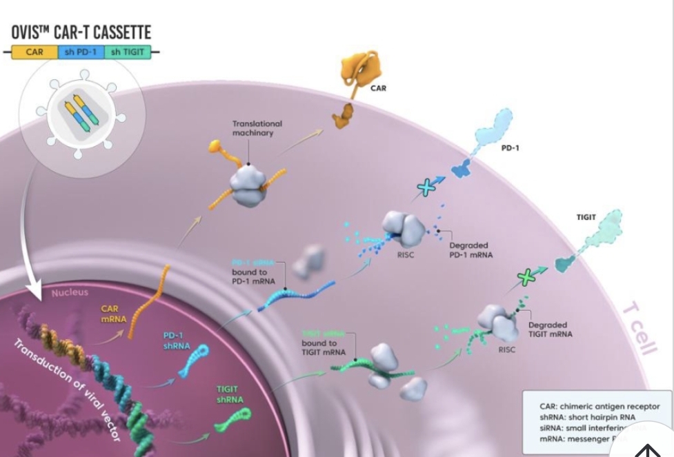 - OVIS™ CAR-T는 T세포 내에서 PD-1과 TIGIT의 mRNA를 타깃하는 shRNA를 지속적으로 생성해, 이들 수용체의 발현을 현저히 낮춥니다.