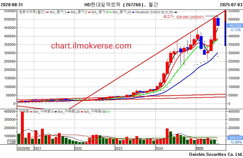 오늘은 HD현대일렉트릭입니다. 위에 월봉 차트를
