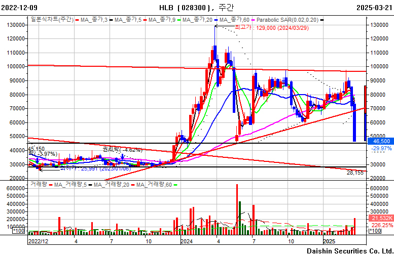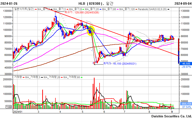 HLB 주봉차트를 보면 9만원권 저항을 받은 후 급락을 하였고, 40도 기울기의 상승추세선까지 한번에 이탈한 상황입니다. 단순 이평으로만 보더라도 이평을 돌려서 지지하는 모습을 만들기에는 상당기간 기간이 소요될 수 밖에 없습니다. 24년 5월에도 동일한 이슈로 급락한 적이 잇는데, 이번에도 똑같이 적용가능할까요?